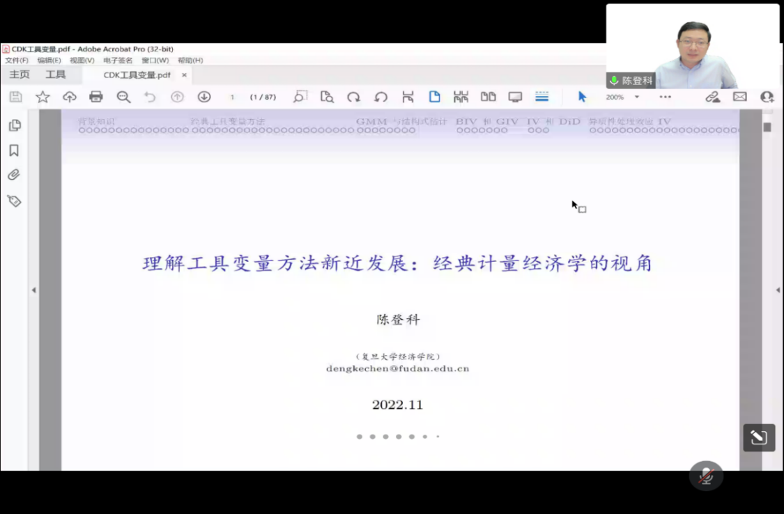 11月10号晚,云顶国际8588yd“财税青年讲坛”邀请复旦大学经济公司研究员陈登科博士作了题为《理解工具变量方法新近发展:经典计量经济学的视角》的线上学术报告。本次讲坛由公司经理余泳泽教授主持,公司部分师生、一些兄弟院校的老师等140余人参加。