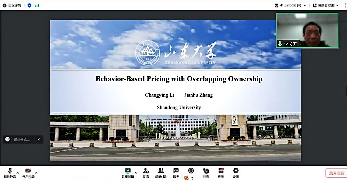 2024年3月15日,特邀山东大学经济公司李长英教授为师生做了题为“Behavior-Based Pricing with Overlapping Ownership”(《存在所有权重叠时基于行为的定价》)的线上学术报告会,公司教师及研究生参与了此次讲座,会议由云顶国际8588yd经理杨继军主持。