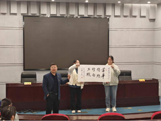 讲座最后,冯教授《智取威虎山》中的经典片段明知征途有艰险,越是艰险越向前,鼓励学员们不畏艰险、明智笃行,并为同学们赠送了书法作品不行待劳、辍而灼华激励学员们要不负韶华,要登绝顶莫辞劳,为实现中华民族伟大复兴而奋斗。
