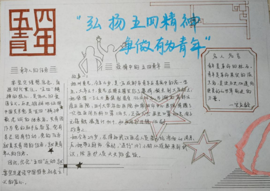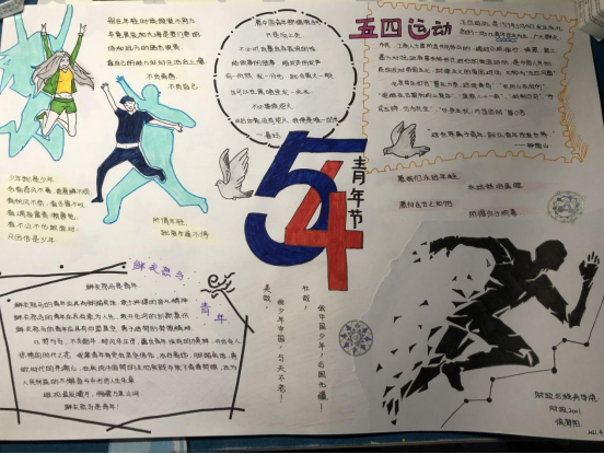 胸怀千秋伟业,恰是同学少年。青年学子们提起画笔,共绘制了百余张画报。一张张手绘的五四史画报,带领大家重温了百年前那段激情燃烧的岁月。财政1901班的周星宇同学通过“Q版画”的手法,为我们再现了五四青年愤怒于丧权辱国,走上街头振臂高呼的画面。青年手握火炬,展示出一种信念和希望,也象征着对光明的追求。“百年后的今天,五四的火炬已经传到我们手中,作为新时代的青年,我们要始终忠诚于共产主义信仰,志存高远,勇做时代的弄潮儿,为建设祖国奉献青春。”这是新时代青年对五四运动的刻画与理解,充斥着青春的热血与激情。