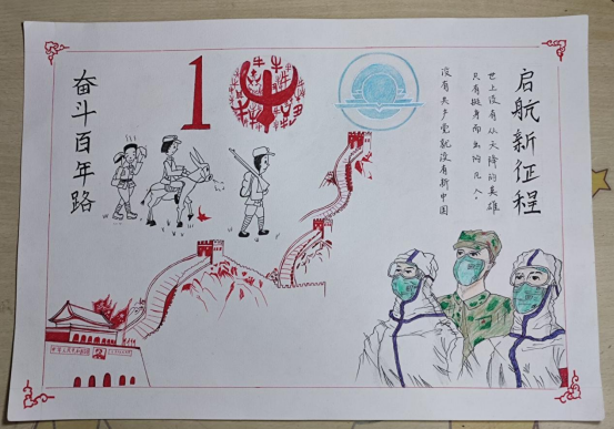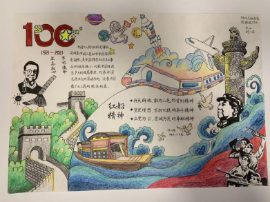 税收1903班的时一未同学从南湖红船的壮丽起航,以神州火箭破云的蓝为主要色调,跨越了战火纷飞的革命年代和热火朝天的建设年代,绘出荡气回肠的党史。她说;“百年党史反映了国家在中国共产党的正确领导下波澜壮阔的发展历程,我们享受着当下幸福的生活,不能忘记先辈们付出的心血。饮水思源,我们要不断向党组织靠近,才能始终向前,创造更辉煌的未来。”
