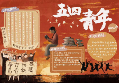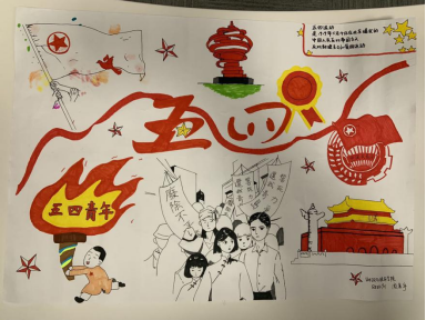 青年们身负理想,是革命的先锋也是未来历史的创造者。财政1801班彭莎妮同学使用精妙的水彩技艺,经过构图、素描稿、色彩稿等环节,呈现出一幅色彩鲜艳、图文并茂的画报,引来同学们驻足观赏。她认为绘画的过程也是自我学习、自我教育的过程,沿着青年的热忱去一览五四精神这条绵延百年的青春红线,在这样一次次的教育中坚定信念,大步向前。