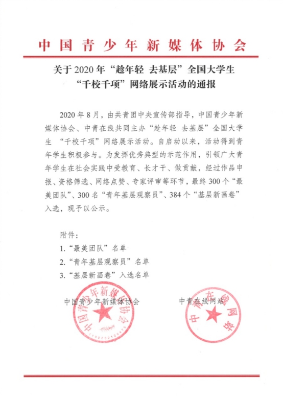 近日,由共青团中央宣传部指导,中国青少年新媒体协会、中青在线共同主办了“趁年轻 去基层”全国老员工“千校千项”遴选结果公布。我院“Radio”队入选“基层新画卷”。