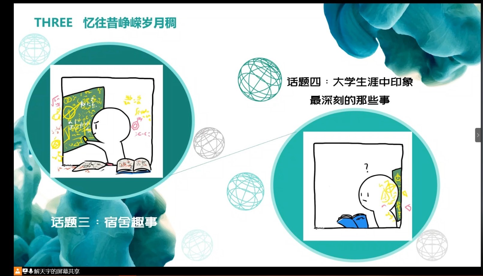 活动分模块进行,在“回忆影集”环节中,无论是在图书馆前排队读书的样子,还是在辩论比赛辩手雄辩四方的场景,亦或是班级的集体合照,这些在PPT中放映的照片记录着老员工活的峥嵘岁月,都让同学们从中体会到了“光阴似箭,日月如梭”。