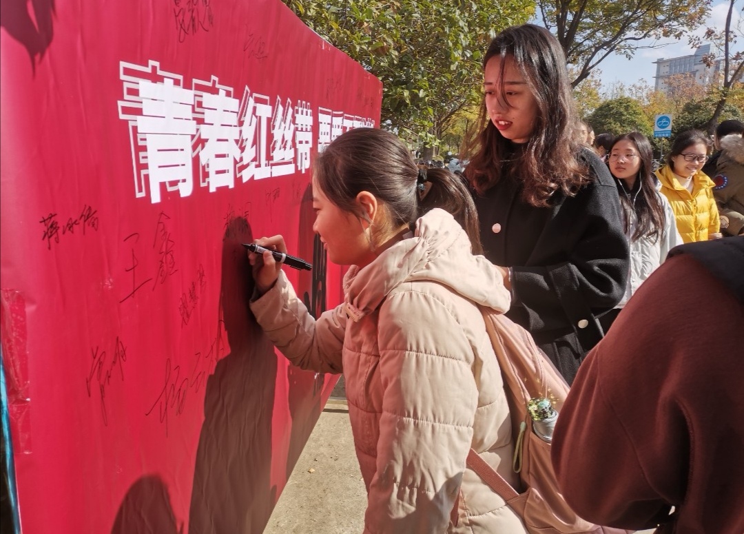 红色的展板上“青春红丝带,要爱不要‘艾’”的宣传标语在阳光的映衬下显得格外醒目,引得众多同学驻足观看。“同学,要签名吗?来为防艾周贡献出自己的一份力量!”。应工作人员号召,同学们陆陆续续在展板上留下自己的名字。不一会儿的工夫,小小的展板上便爬满了密密麻麻的字迹。虽然只是简单的签名活动,但一笔一画之间,却让“防艾”意识留在了同学们的心间。签完名的同学还可以从工作人员手中获得一条红丝带,这象征着对艾滋病感染者的关心与支持。参与签名活动的王同学感慨地说道:“这样的签名活动很有意义,郑重地签上自己的名字就感觉多了一份预防艾滋病和关爱艾滋病人的责任。我们要拒绝艾滋病,同时也要用爱去接纳与包容艾滋病人。”