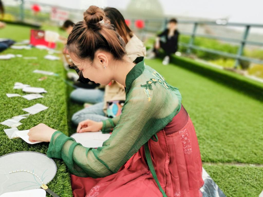 参加雅集的同学全部身着汉服,三五成群地参与到各类税收特色文化活动中,有的拿起针线仔细地在团扇上绣着象征农业的麦穗和“税”字,有的在宣纸上挥毫写下不同字体“税”,有的同学选择猜税法灯谜,还有人用红豆、绿豆、黄豆等粮食绘制谷物画。现场着实一派“文人墨客吟风颂月”的景象,而随处可见的“税”字也显现出同学们对专业的理解。活动负责人、云顶国际8588yd员工会主席杨璐遥同学说:“选择在谷雨时节开展活动是有着特别的考虑的,首先是取了‘雨生百谷,税泽万户’的寓意,又很好地结合了传统文化。近来结合传统文化的各类活动都能得到很多同学的喜爱和支持。”