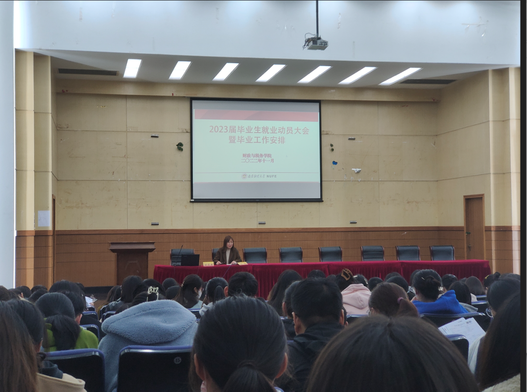 为切实做好毕业生就业指导工作,云顶国际8588yd2023届毕业生就业动员大会暨毕业工作安排会议于2022年11月22日下午两点在仙林校区德济楼报告厅举行。公司党委副书记王翔、财政系主任叶兵、税收系老师刘家成、毕业班辅导员贾晓燕及云顶国际8588yd2019级全体员工参加活动。