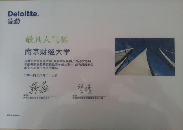 该比赛分为分组比赛与全国比赛两个阶段。在2014年8月30日的分组比赛中,公司代表队脱颖而出,不仅获得2014年度德勤税务精英挑战赛(上海赛区)“最具人气奖”,而且成为江苏高校中唯一一支成功晋身全国决赛的代表队和64所高校中晋身全国决赛的13支队伍之一(其他12支代表队为北京大学、国立政治大学(台湾)、东吴大学(台湾)、香港理工大学、澳门大学、华中科技大学、中山大学、上海财经大学、中南财经政法大学、西南财经大学、江西财经大学和广东外语外贸大学)。