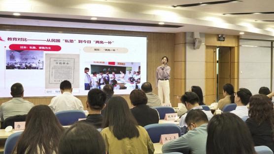 党委书记陈苏介绍道:把博物馆展陈融入到读书分享会的‘沉浸式学习场景’,构建了老员工思政教育从理论认知到价值内化的完整链条。我们校馆合作项目组在策展中将书中一些关键问题与展品、场景对应,通过分享会双师课等形式形成‘阅读—观展—验证’的闭环体验‘以书载道、以文化人’思政实践的一种创新尝试