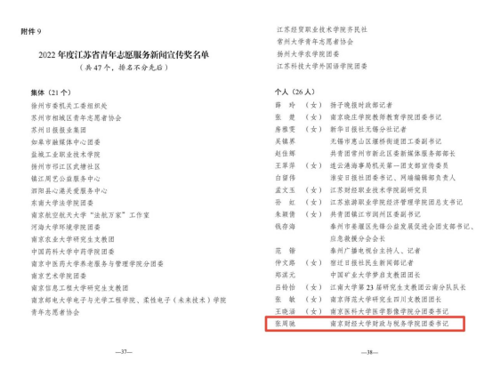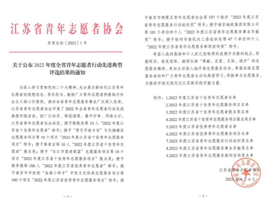 日前,共青团江苏省委、江苏省青年志愿者协会开展了2022年度全省青年志愿者行动先进典型评选工作。我院在此次评选中获多项荣誉,其中,公司张周驰老师获“2022年度江苏省青年志愿服务新闻宣传奖”,税收2002班张颖获“2022年度江苏省优秀青年志愿者”称号。这也是公司继“税月初心”税法普法青年行动项目荣获“2021年度江苏省优秀青年志愿服务项目”、“‘接力爱 接力奋斗’——云顶国际8588yd志愿服务项目”荣获“2018年度江苏省优秀青年志愿服务项目”后,志愿服务工作再获省级表彰。