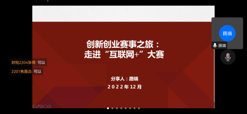 活动伊始,路端老师根据比赛流程,从自我介绍、“互联网+”大赛简介、参赛经验、通知解读以及参赛意义五个方面进行了讲解,介绍相关赛事流程以及注意事项,并向大家展示有关答辩的技巧,同学们认真聆听并积极响应。该环节氛围轻松愉快,为同学们提供了极大帮助。同时,路端老师鼓励大家积极参与到大赛实践中去,并对比赛的准备、选题、申报、推进和结束各个环节做了详细阐述,结合党的二十大的有关理论,指出比赛选题要结合官方文件,符合市场潜力需求。