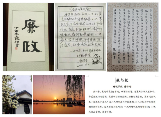 本次征集活动共收集到来自全院师生50余份参赛作品,既包括书法、绘画、文学作品,也包括摄影、朗诵等新媒体形式作品,内容丰富、形式多样。公司税务系党支部吴国平副教授以硬笔书法写下习近平总书记的廉政警句,发人深省;财政系党支部李婧副教授则以“心向阳光不染尘,便是人间好风景”为灵感,捕捉下石头城傍晚的动人瞬间;殷立荣老师以“莲之出淤泥而不染”为题创作的国画,描绘出莲花的高雅,栩栩如生;公司青年教师蒋诗雨则动之以情,写下《廉与教》一文,“‘廉’者,既可作‘刚正’,亦可谓‘廉洁’”、“我们无论身处何位,都必须把正直廉洁铭刻心中,才能身正言直。”,表达自己的廉洁决心;税收2003刘英雪同学和财政2002何羿锋同学则共同合作,以饱含深情的朗诵,表达了自己对廉洁文化的理解。