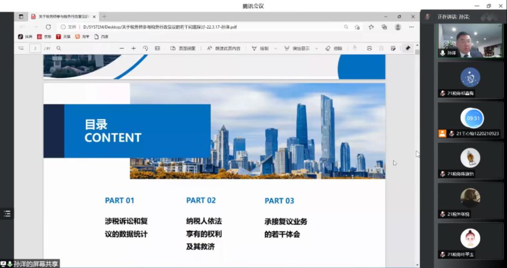 讲座伊始,孙洋教授全面阐述了本次讲座分享内容的背景、学习掌握税法的几个层面、税务行政复议和诉讼近年来引起社会各方面的广泛关注;其次,孙教授展示了涉税诉讼和复议的数据统计,从多个维度对数据进行分析说明,如分区域税务行政诉讼案例数量、税务行政诉讼裁判文书类型、一审原告类型、案例经历行政复议的情况等,揭示了税务争议往往和经济发展水平相关、实体审理案例占比低、自然人作为原告占比高、许多原告不能分辨行政复议与诉讼、大部分行政复议作出维持决定等特点;再次,孙洋教授展示了国家税务总局公告2009年第1号规定的纳税人依法享有的权利,其中对税收法律救济权进行了深入系统的分析。并以宁波亿泰案的具体案例说明纳税人进行税务行政复议要注重时限要求等,同时,他以一份税务局发出的错误文书为例,鼓励纳税人依法维护自己的税收法律救济权;讲座最后,孙教授分享了自身作为税务师承接复议业务的若干心得体会,包括社会背景变迁、市场供需情况、承接复议业务的优势等。