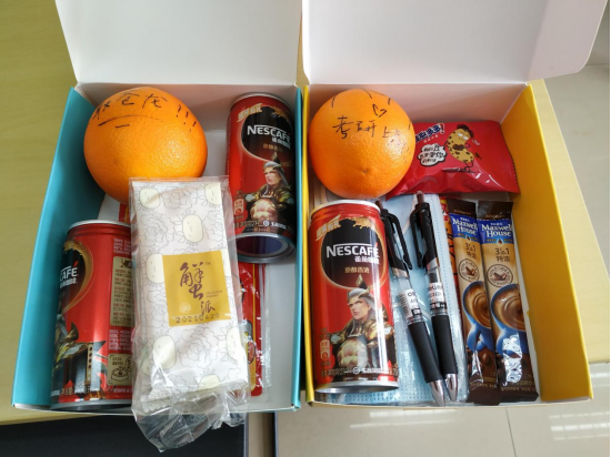 漫漫寒冬,近日,公司的考研学子们收到了一份“考研橙功鸭”盲盒:暖心橙子,精美文具,助力咖啡,惊喜零食,口罩暖宝······冬日“研”途,丝丝温情洋溢于盲盒之中。