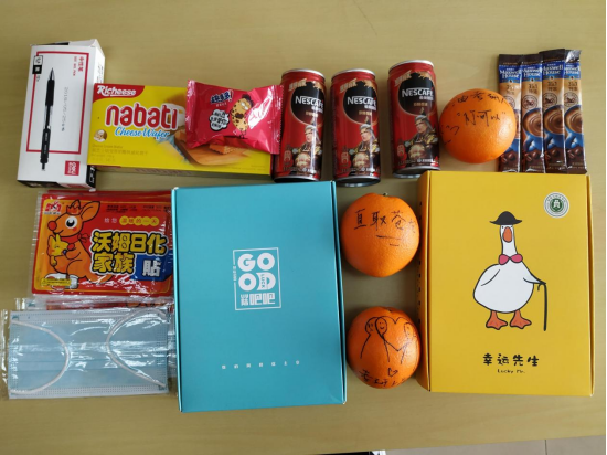 此次“暖冬送温暖”行动筹备了近一个月,从礼物的精心挑选、定制采购、创意图案的绘制,每一个礼物都包含公司师生的浓浓情义和深深祝福。简约大气的盲盒清新靓丽,而里面的礼品也让人耳目一新。橙子上写了“一研为定”、“鱼跃龙门”等等祝福话语,祝语旁可爱的简笔画令人忍俊不禁,寓意金榜题名的文具套装,驱赶严寒的暖宝宝给考研学子最有力的支持……收到“考研橙功鸭”盲盒的同学们纷纷表示受到了鼓励,将更加努力,不负大家的期望。