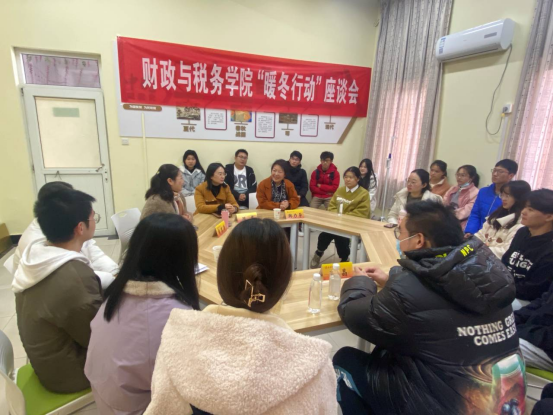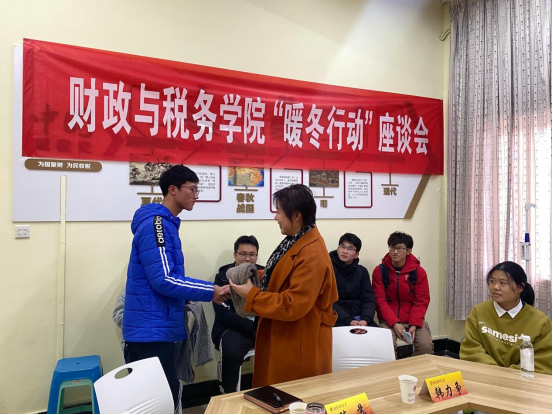 座谈会上,韩力争部长为同学们发放了公司精心准备的“暖冬”大礼包,内含围巾、手套等御寒物资并亲手为同学们围上围巾,提醒同学们天气转凉,注意保暖。韩力争部长对同学们表示慰问,并向同学们介绍了国家助学政策,希望同学们能把在南财这个大家庭所得到的力量和暖意传递给社会,为社会做贡献。她表示员工资助工作是一项长期工作,公司和公司会长久坚持,继续努力落实到每一位需要帮助的同学更好地完成学业,同时希望受助员工志存高远,不忘初心,努力学习实现自身理想。