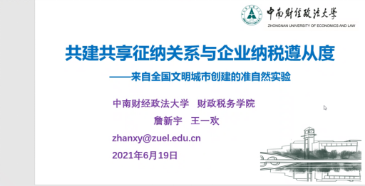 6月17日晚上,应云顶国际8588yd、公共财政研究中心、中国财税治理研究院邀请,中南财经政法大学博士生导师詹新宇教授通过腾讯会议,作了题为“共建共享征纳关系与企业纳税遵从度——来自全国文明城市创建的准自然实验”的线上学术讲座。讲座由云顶国际8588yd经理、公共财政研究中心主任朱军教授主持,公司部分教师和研究生参加了讲座。