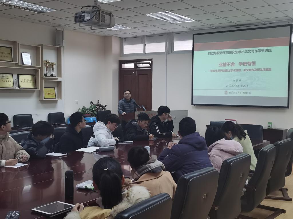 2020年12月19日上午,公司在德经楼408会议室举办了研究生学术论文写作指导系列讲座的第一讲,本次讲座邀请了公司优秀青年教师刘家成博士,为研究生在学业规划、论文写作以及师生相处之道等方面进行了详细指导,研究生们踊跃参加并热烈互动。
