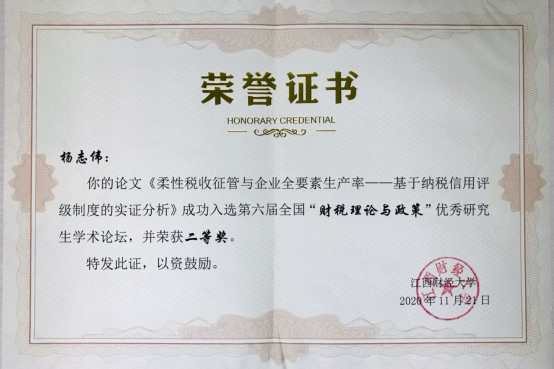 2020年11月20-22日,由全国高校财政学教学研究会、江西财经大学共同举办的第六届全国“财税理论与政策”优秀研究生学术论坛在江西财经大学举行。公司19级硕士研究生杨志伟(指导老师:朱军)的论文《柔性税收征管与全要素生产率——基于纳税信用评级制度的实证分析》成功入选,并荣获二等奖。