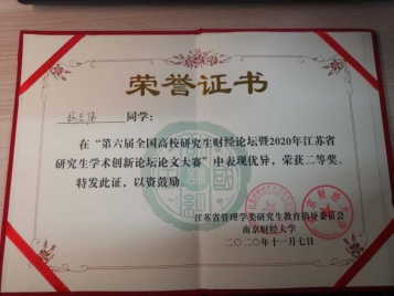 11月7日,公司2019级专业学位硕士研究生杨志伟(导师:朱军教授)撰写的论文——《长三角一体化视角下的财政分权与教育均等化研究》,在第六届全国高校研究生财经论坛暨2020年江苏省研究生学术创新论坛论文大赛中荣获二等奖。