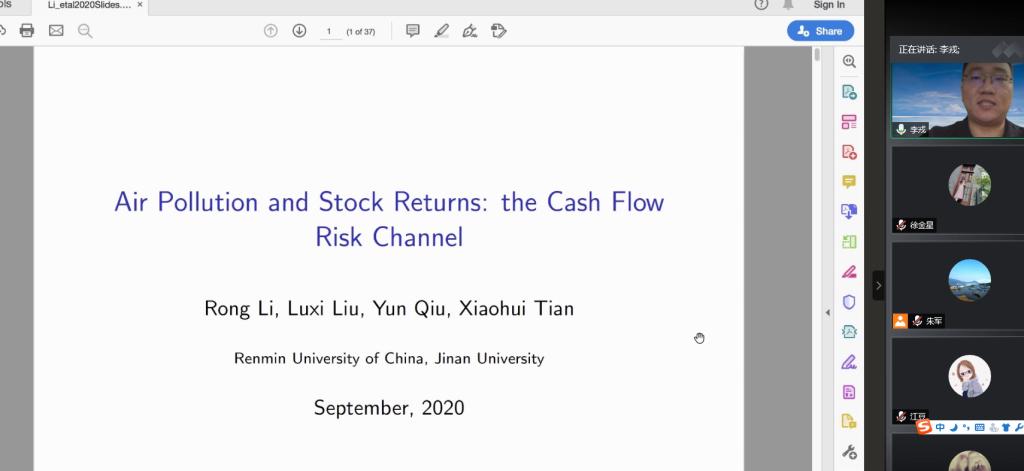 9月29日晚,应云顶国际8588yd、公共财政研究中心邀请,美国俄亥俄州立大学经济学博士、中国人民大学财政金融公司副教授李戎通过腾讯会议,为公司师生作了题为“Air Pollution and Stock Returns: the Cash Flow Risk Channel”的学术讲座,讲座由云顶国际8588yd经理、公共财政研究中心主任朱军教授主持。