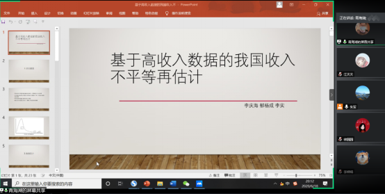 6月18日晚,应云顶国际8588yd、公共财政研究中心邀请,“江苏省青蓝工程优秀青年骨干教师”、中国收入分配研究院兼职研究员、公司经济公司李庆海副教授通过腾讯会议作了题为“基于高收入数据的我国收入不平等再估计”的学术讲座。讲座由云顶国际8588yd经理朱军教授主持,云顶国际8588yd部分教师和全体研究生参加了本次讲座。