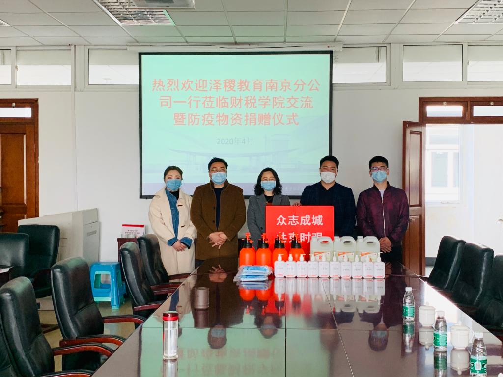 4月10日下午,泽稷教育南京市场部总监、总裁助理宁兆丰一行4人到公司捐赠了高浓度消毒液、洗手凝胶、一次性口罩等防疫物资。公司党委书记陈苏、经理朱军、党委副书记李慕原出席捐赠仪式。