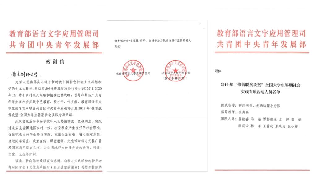 近日,教育部语言文字应用管理司和共青团中央青年发展部联合向公司发来感谢信,对我院的助力“推普脱贫攻坚”专项暑期实践活动表示感谢,对参与此次活动的师生予以表扬。