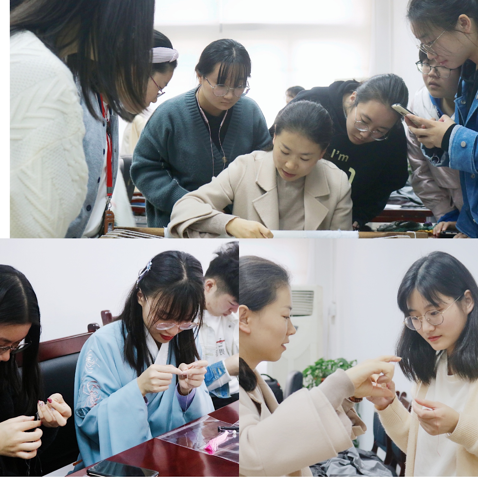 同学们一边在自己的扇面上尝试,一边就配色、针法等问题,频频向老师求教。来自印度尼西亚的职工KUMALA CORNELIA(邱诗思)同学说:“看着容易,自己一上手就发现好难。小小的扇面、细细的针、细细的线可以有这么多种变化,真的感受到中华传统文化的魅力。”