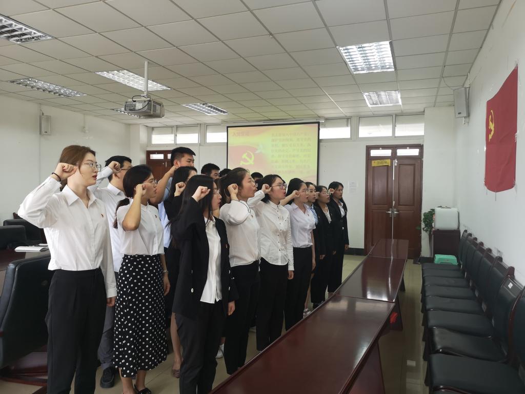 最后,老师们给全体毕业生党员佩戴党徽,在党旗下庄严宣誓,重温入党誓词;祝愿毕业生党员在今后的学习和工作中能一直做到“不忘初心、牢记使命”。