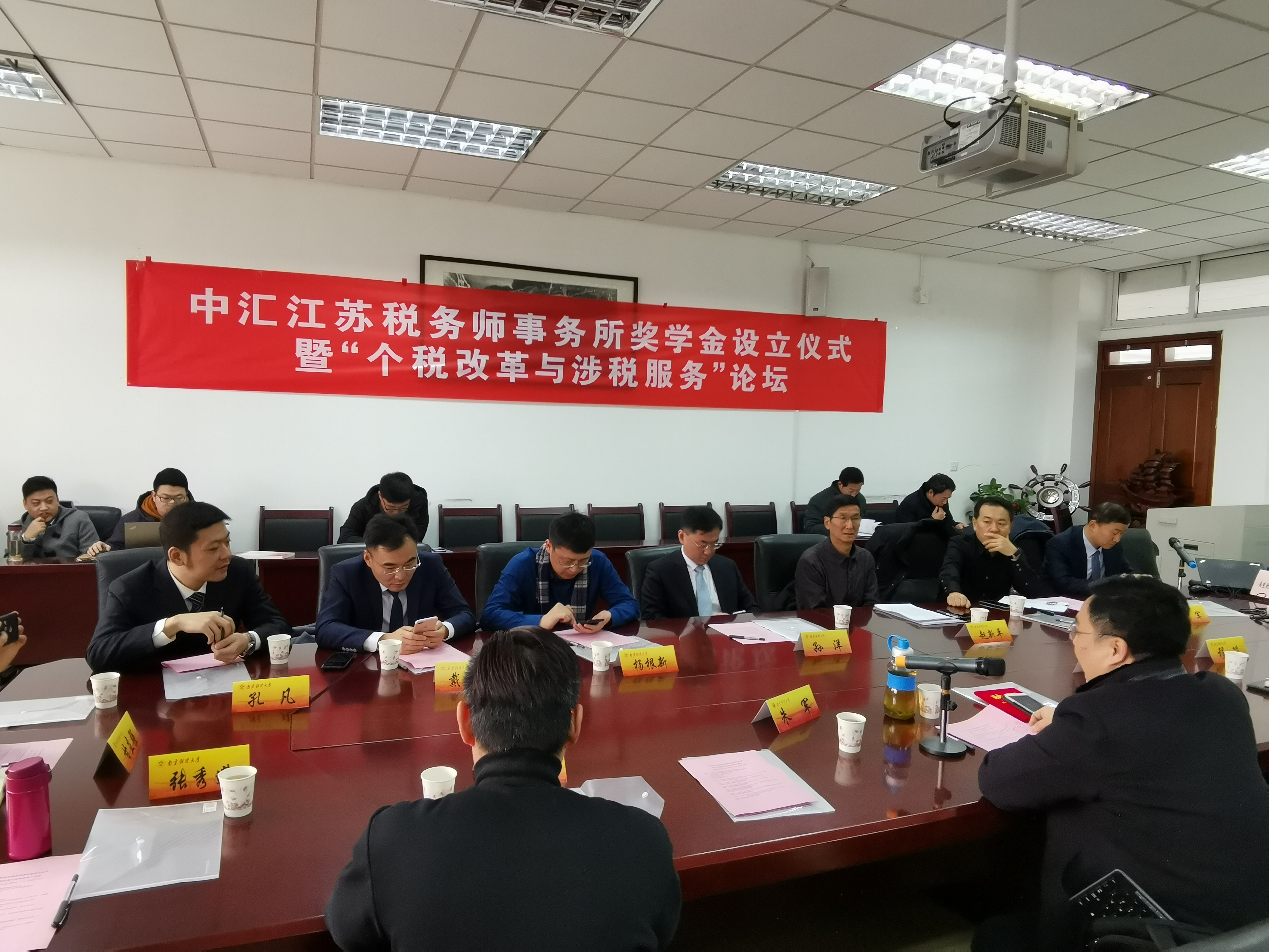 1月15日下午,“中汇奖学金”捐赠仪式暨“个税改革与涉税服务”论坛在公司仙林校区德经楼408会议室举行。江苏省注册税务师协会常务理事、原江苏国税副巡视员赵新平、中汇江苏税务师事务所董事长孙洋、云顶国际8588yd对外联络处副处长姚智谋、云顶国际8588yd全体党政领导、部分教师与员工参加了此次活动。仪式由副经理管永昊主持。