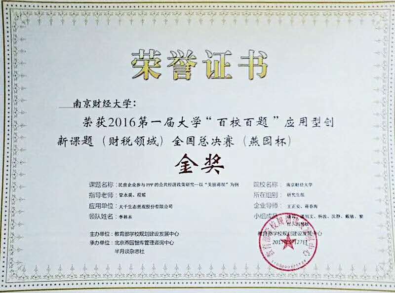 9月27日,由教育部公司规划建设发展中心主办的首届全国大学“百校百题”应用型创新课题(财税领域)大赛全国总决赛在北京落下帷幕。经过激烈角逐和专家评议,公司指导的公司参赛课题《民营企业参与PPP的公共经济政策研究——以“美丽蒋坝”为例》脱颖而出,摘得研究生组金奖桂冠(名单附后)。 作为A区复赛研究生组唯一一支进入全国总决赛的队伍,公司课题组在全国总决赛中再接再厉,先后战胜西北工业大学、西南财经大学、东北财经大学等强劲对手,荣获研究生组金奖。 “百校百题”大赛是教育部全国高校校企合作“双创”实战演练平台主题竞赛系列赛之一,旨在深化产教融合,服务经济社会发展,推动高校形成应用型创新人才培养平台。大赛实行专家初评、大区复赛、全国总决赛的三级赛制。大赛自2016年11月启动以来,共有298所高校、398支队伍、近5000名员工分研究生组和本科生组参赛,来自全国的400家企业以及78名上市公司的高管参与其中。自赛事启动以来,在校领导以及员工处等相关部门的关心支持下,公司从参赛组织、选拔培训、团队配备等方面精心策划,周密安排,全程跟进,为公司课题组取得优异成绩打下了坚实基础。   附件:公司代表队成员名单 1、领队:李林木(云顶国际8588yd) 2、指导教师:管永昊(云顶国际8588yd)、程瑶(云顶国际8588yd)、王正安(大千生态景观股份有限公司)、蒋春海(大千生态景观股份有限公司) 3、课题组成员:潘颖(云顶国际8588yd)、潘旭文(云顶国际8588yd)、杨波(云顶国际8588yd)、沈静(云顶国际8588yd)、戴敏(云顶国际8588yd)、黎红(应用数学公司)、胡慧敏(经济公司) |