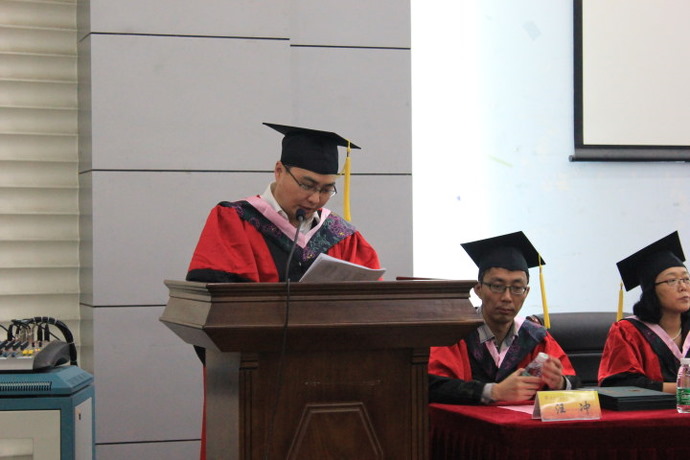 仪式伊始,党委副书记陈苏依次介绍了主席台嘉宾。全体起立,奏唱国歌。庄严的国歌与报告厅凝重的气氛相称,见证着又一次的离别。随后,公司副经理黄斌教授致辞。他认为大学毕业走入社会是人生中一个十分重要的时刻,也是一段追求幸福的旅程。在这段旅程中希望同学们能不被物欲所困,而追求存在于分享、尊重和高层次人生价值中的幸福!做自己喜欢做的事,学会坚持,不轻易言弃。最后,黄经理将电影《致青春》中一句话作为结句送给毕业生:“这年华青涩逝去,却别有洞天。”