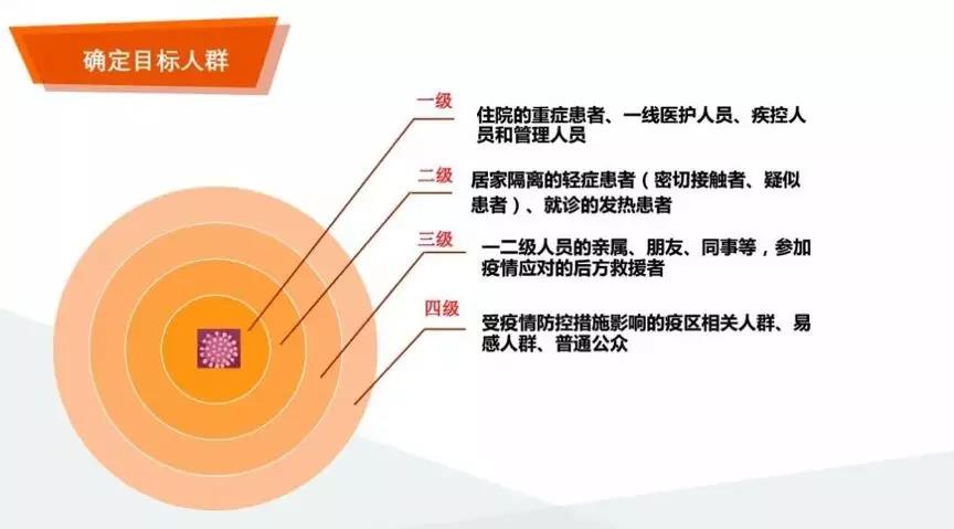 日前,国家卫生健康委员会发布了《新型冠状病毒感染的肺炎疫情紧急心理危机干预指导原则》,明确了对目标人群分类干预的工作思路(如下图)。